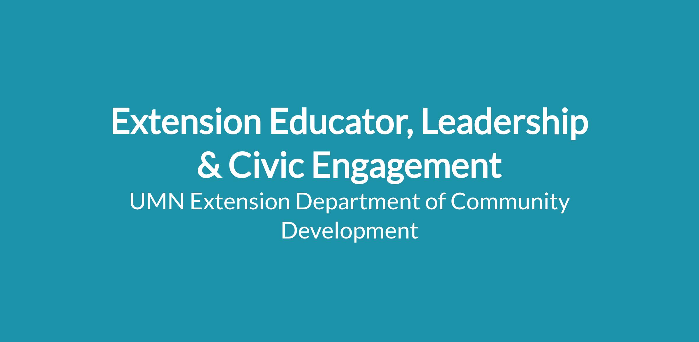 Extension educators in leadership and civic education (LCE) lead the design, development, delivery, and evaluation of research-based Extension programs that support Minnesota communities. They serve as a subject matter expert in leadership development, civic education, placemaking, facilitation, and managing community conflict for regional and statewide audiences. LCE educators engage with communities to strengthen local leadership, create responsive tools and programs, and lead applied research that addresses current issues.